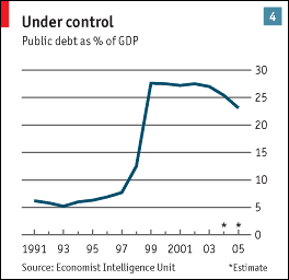 China's economy has a number of strengths beyond its rapid growth. Government finances appear reasonably healthy, with national revenue growth averaging 18% a year since 1994, a deficit of 1.6% of GDP and public debt of less than a quarter of GDP (see chart 4). This gives the government some room to pump up the economy if need be. China has one of the world's highest saving rates, at some 40% of GDP, and foreign-exchange reserves of $845 billion, second only to Japan's.