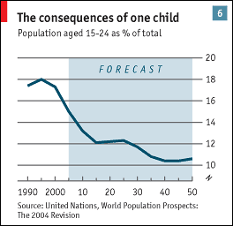 Goldman Sachs, an investment bank, reckons that China's demographic bonus of a large working-age population with a small number of dependants (helped by the one-child-per-couple policy introduced in the late 1970s) will shortly run out as the number of young workers starts declining (see chart 6). The country's dependency ratio will begin to rise by 2010, whereas India, on current trends, will not reach that point until 2040.