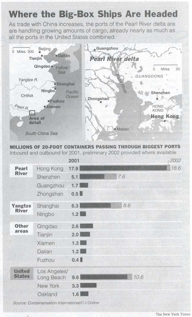 The port, open less than eight years, is just one of a half dozen in the Pearl River delta in southeastern China, including the world's busiest container port, Kwai Chung in nearby Hong Kong. Together these ports now handle almost as many containers as all the ports in the United States combined, and are growing much more swiftly. More than a third of the electronic goods, clothing and other products that flood through here are headed for America.