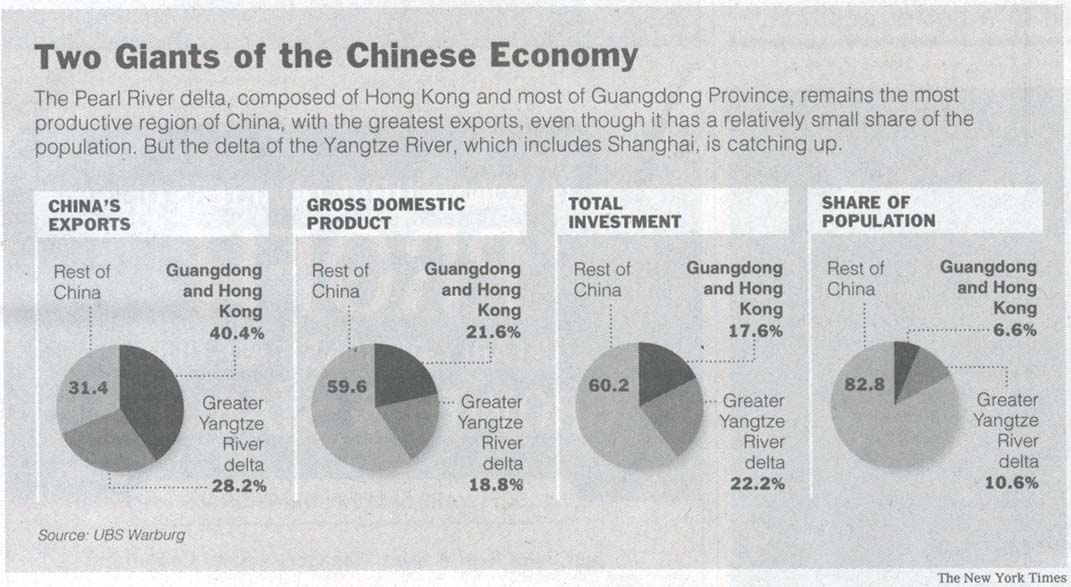 The Pearl River delta still has a slightly greater economic output and exports. But the Yangtze River delta is attracting more domestic and foreign investment. It is also far ahead in growth industries like heavy manufacturing, computer chip fabrication and financial services that Beijing sees as more important to China's future than the light industry that dominates the Pearl River delta.
