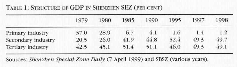 After 20 years of development, Shenzhen SEZ has evolved into a modern city of 3.5 million people with a per capita GDP of approximately US$4,000. Over its period of development, the annual rate of GDP growth reached 32 per cent, while the share of primary industry in GDP steadily declined as shares of secondary and tertiary industries increased notably, as shown in Table 1.