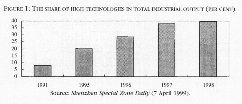 Moreover, the manufacturing industries within Shenzhen SEZ have been steadily upgrading in terms of technological sophistication. As shown in Figure 1, Shenzhen SEZ is becoming a centre for high-technology industries, indeed a "new technology tiger" in its own right (Guynne 1993). In 1998, high-technology industries accounted for nearly 40 per cent of industrial output within Shenzhen SEZ. High-technology industries, rather than labour-intensive industries, now support Shenzhen SEZ's dynamic economy.