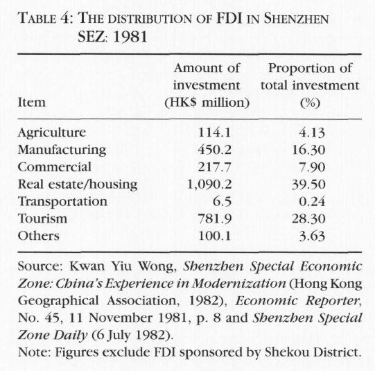In 1981, as Table 4 shows, during the early stages of development, more than twothirds (67.8 per cent) of FDI in Shenzhen went to tourism and real estate development and only 16.3 per cent to manufacturing activity. Tourism and real estate development were initially more successful than manufacturing in attracting overseas capital to Shenzhen SEZ because of inadequate infrastructure (such as unreliable supplies of electricity and water, and a lack of housing and communication links). Investment in manufacturing also requires a large capital outlay and a longer period of return on investment (ROI) which involves an inherent risk, whereas in real estate development the period of return is shorter and profit margins are higher. FDI in tourist industries can be explained by the relative ease with which such investment is recouped, given that tourism caters exclusively for overseas visitors in possession of hard foreign currencies (along and Chu 1985; Changyu 1994). A third factor in the relative scarcity of manufacturing FDI was a lack of adequate institutional framework.